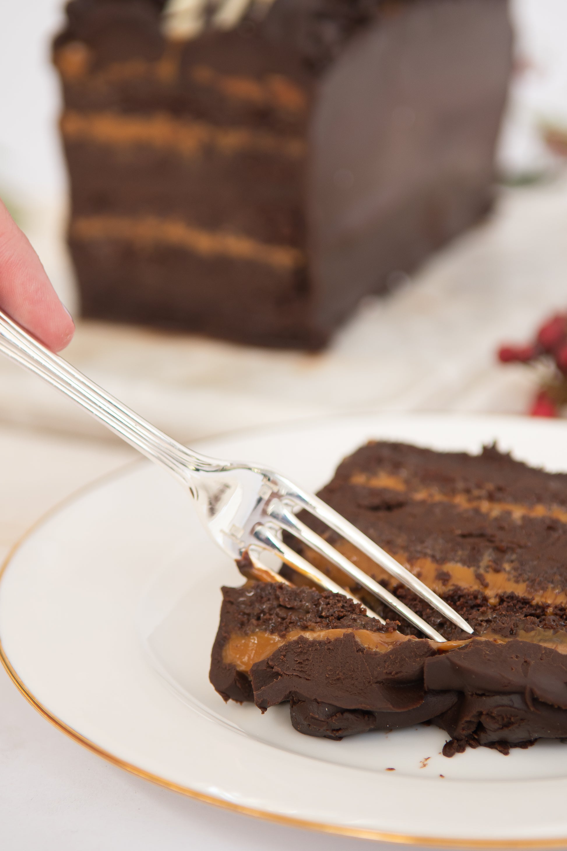 Torta de chocolate bien húmeda, con manjar y ganache de chocolate. Forma rectangular.